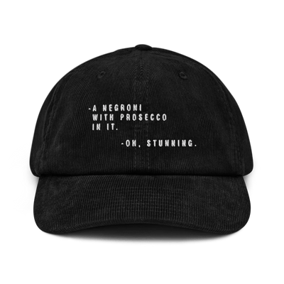 But what truly sets these hats apart is the intricate embroidery designs, featuring witty texts such as "Negroni Please", "Scusi Aperol Spritz", "Got Beer?", "Pour Me Wine", "Give Me Champagne" and more. These designs are sure to add a touch of elegance and originality to any outfit. Each hat features a cotton twill sweatband and taping for added comfort, and an adjustable buckle for a perfect fit. Upgrade your wardrobe with our corduroy hats today.