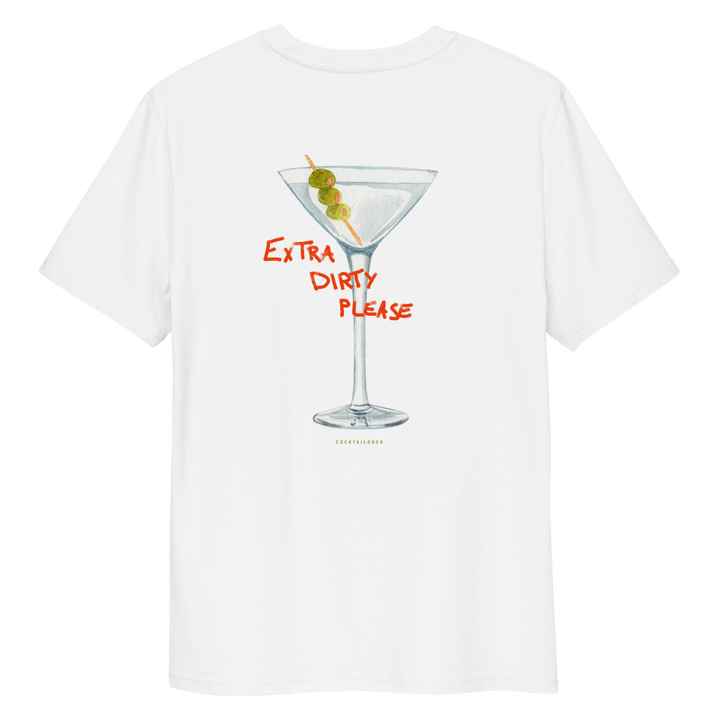 Introducing the latest addition to our cocktail-inspired collection: the Extra Dirty Martini Organic T-Shirt." Crafted from 100% organic ring-spun cotton, this unisex tee offers both comfort and sustainability. The front features a subtle design, while the back showcases a bold graphic inspired by the classic extra dirty martini, capturing the essence of sophisticated indulgence.